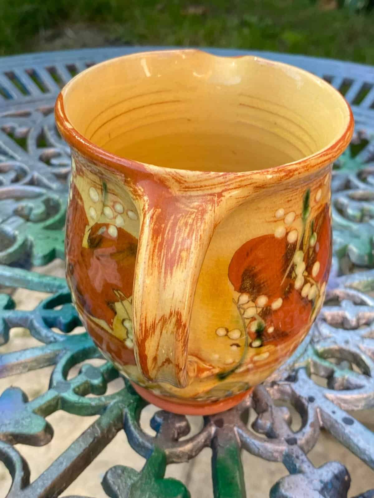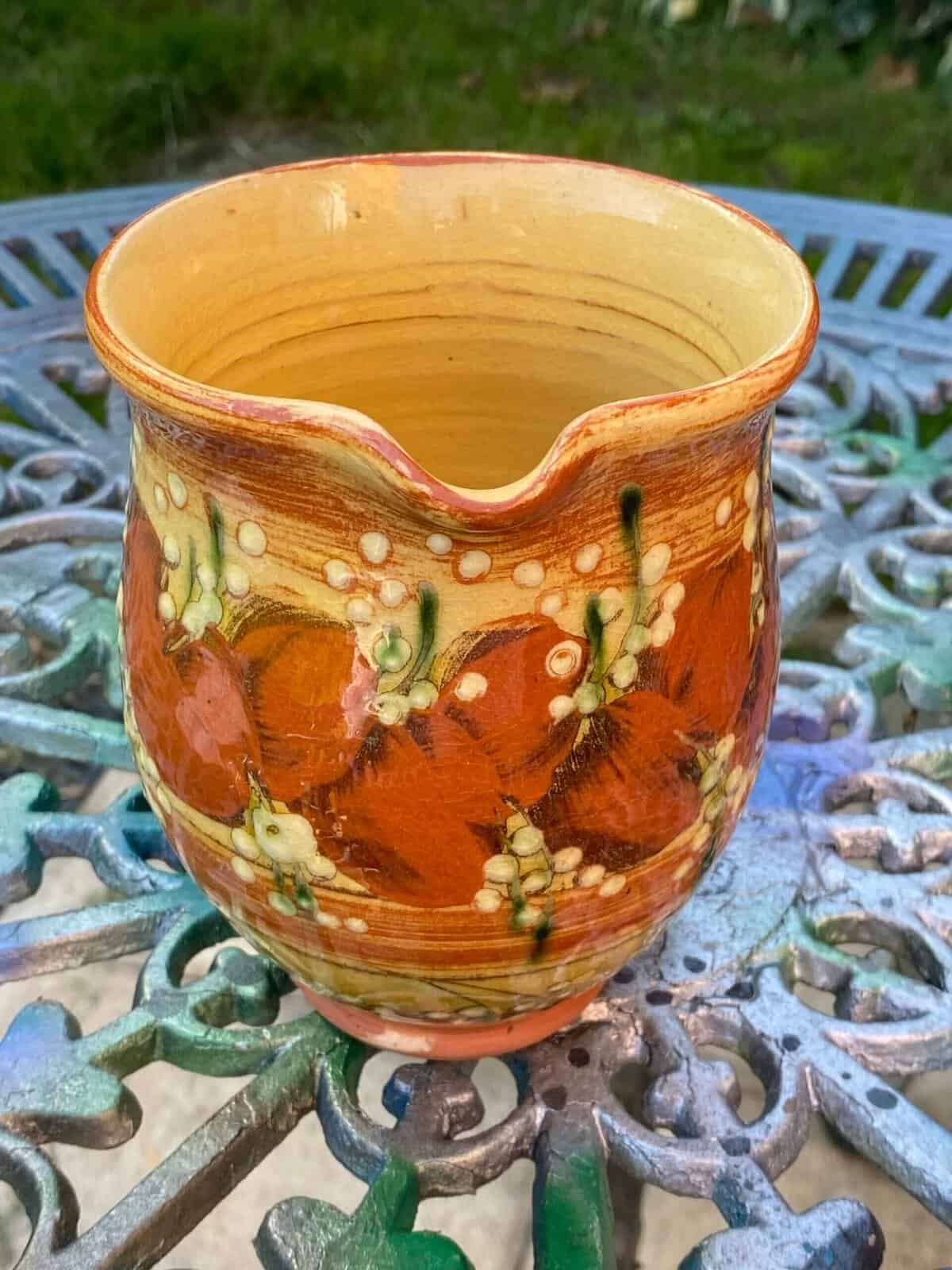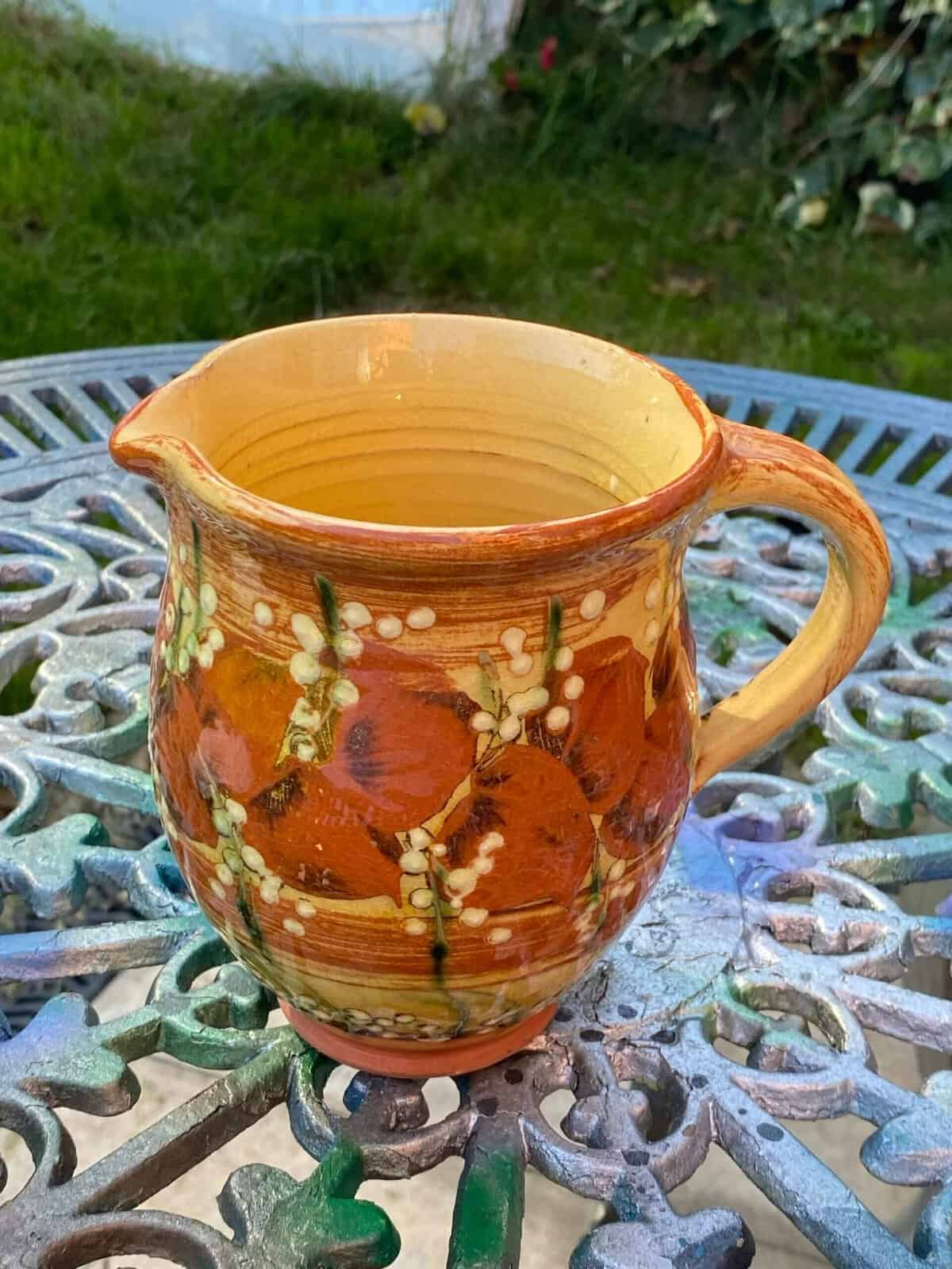 Lovely terracotta hand painted jug possibly french french country farmhouse style terra ores ant mustard shades brown white florals size is 6″ x 4″ dia great vintage condition no chips or breaks
