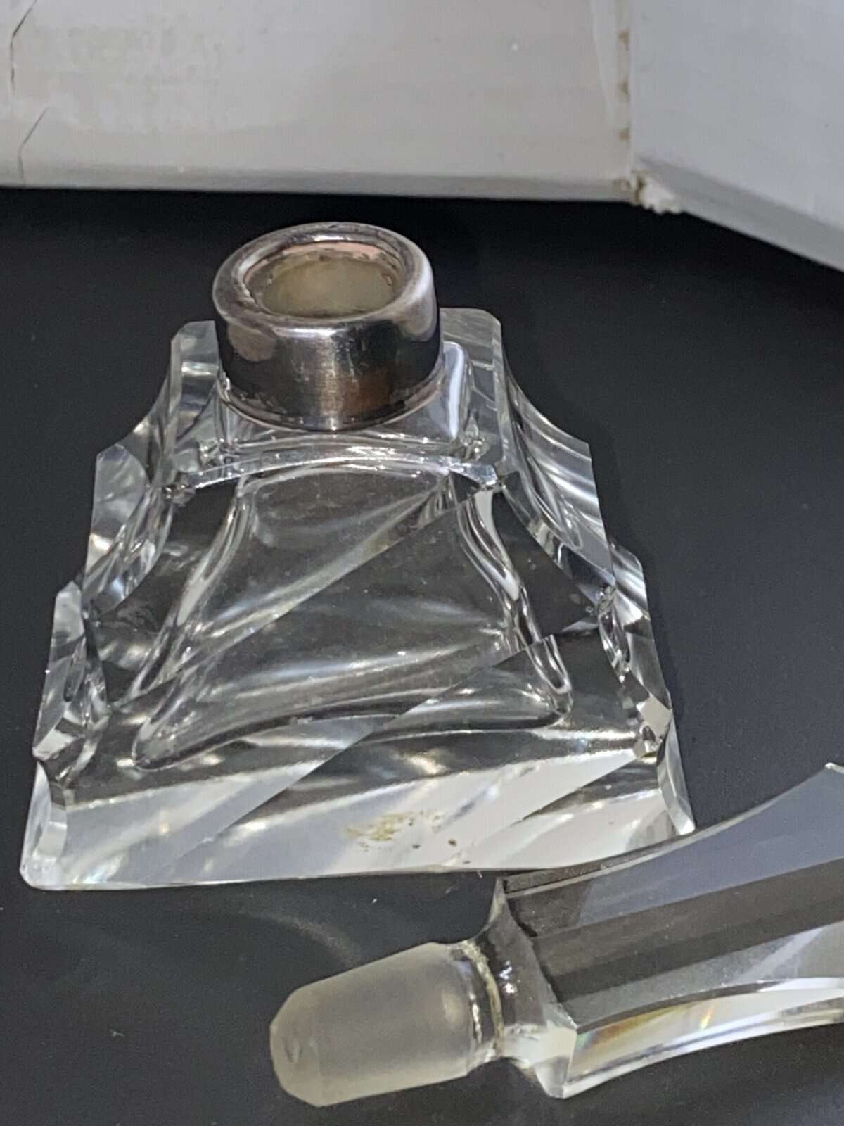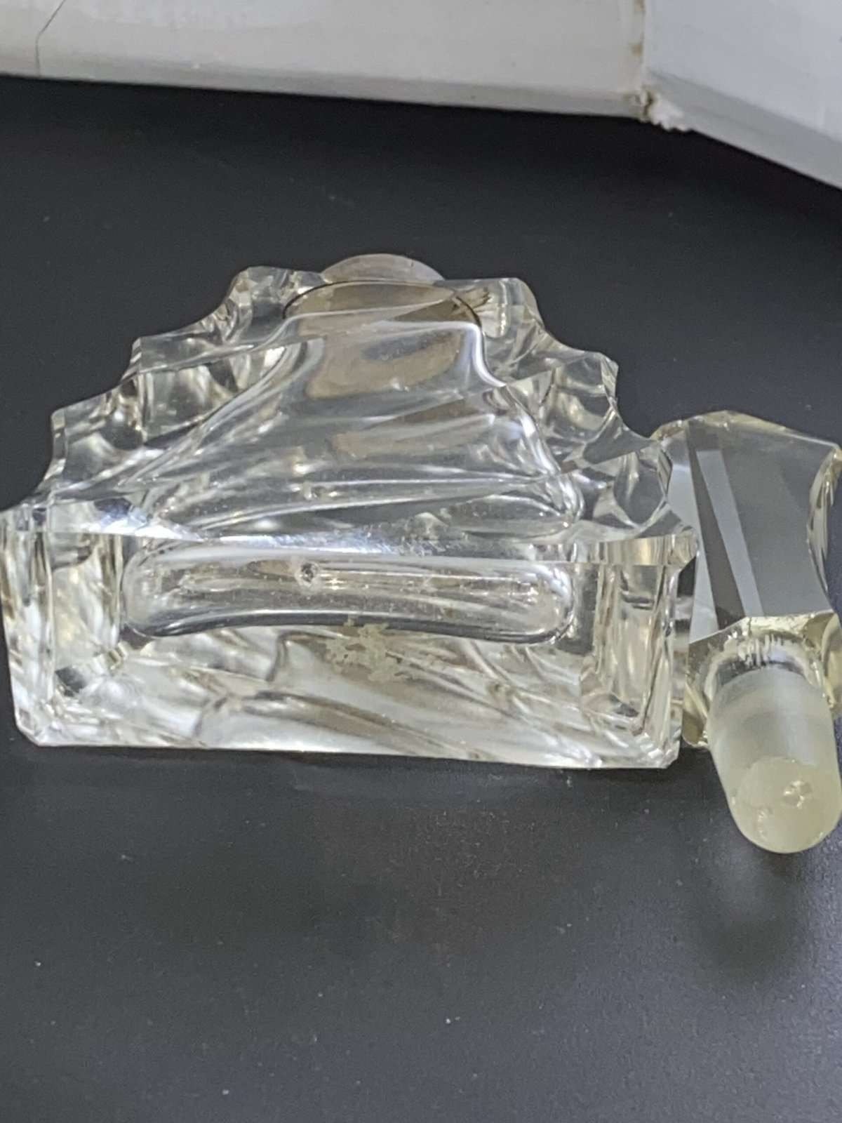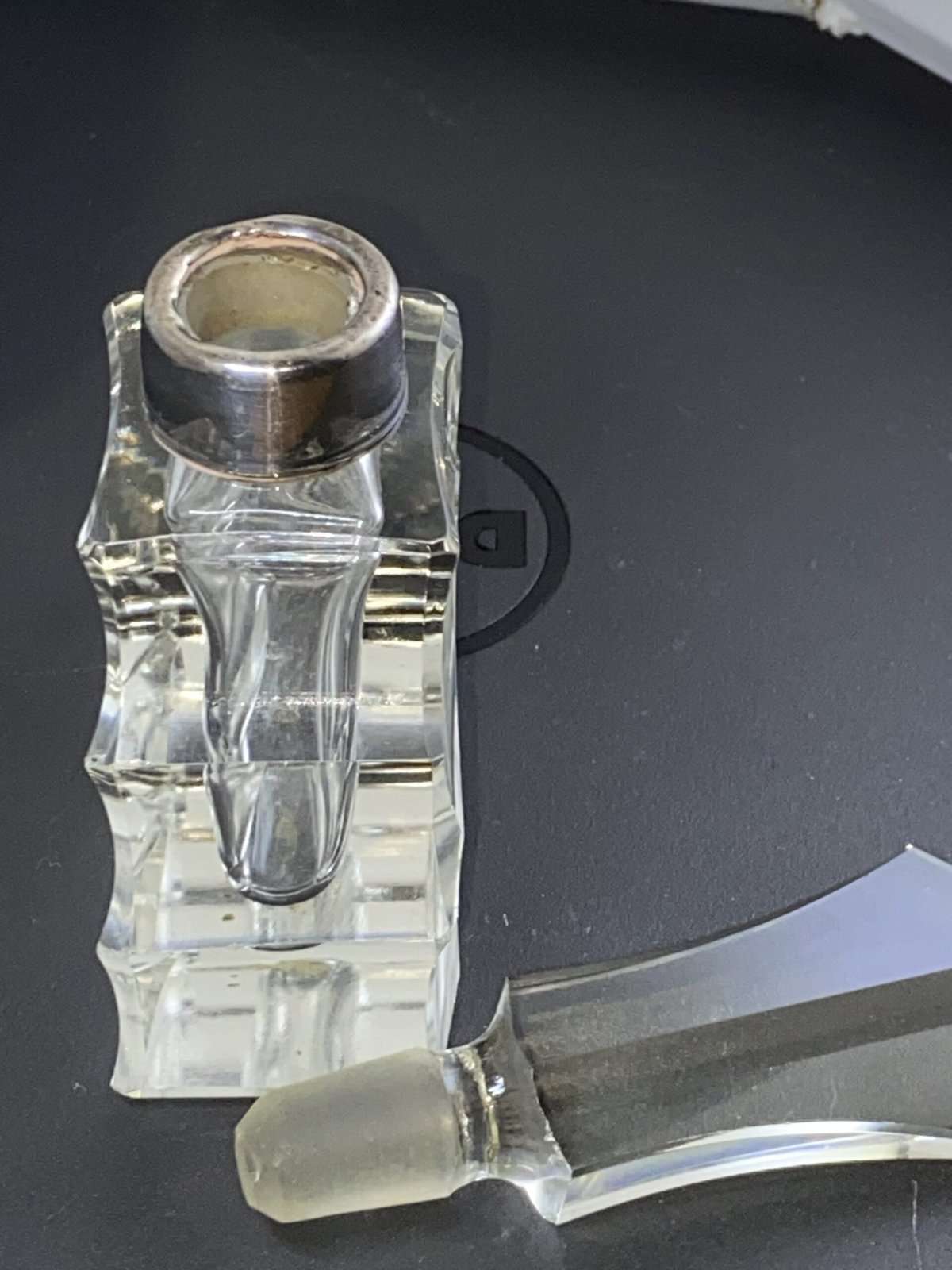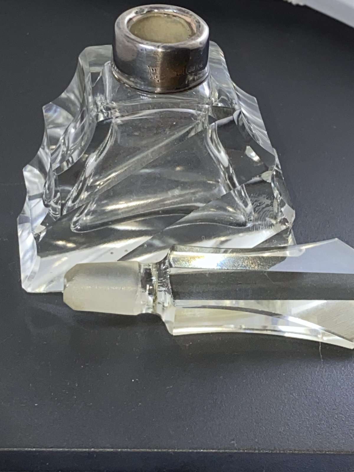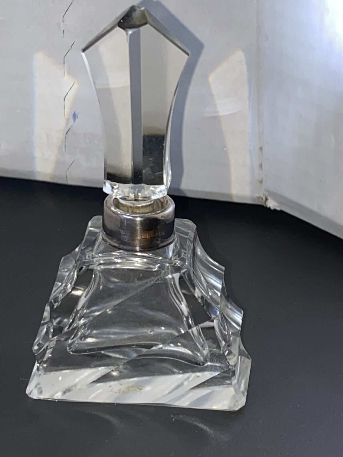 WE HAVE AN ABSOLUTELY STUNNING ART DECO SILVER TOPPED PERFUME BOTTLE.